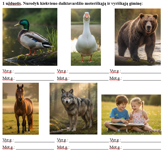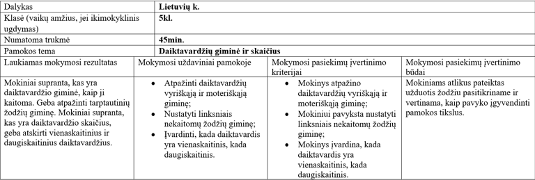 · Užduočių, kurias atliks mokiniai: Individuali užduotis. Mokiniai individualiai užrašo duotų paveikslėlių moteriškąją ir vyriškąją giminę. Individuali užduotis „Viktorina“. Trumpa apklausa, kaip vaikai atpažįsta linksniais nekaitomų daiktavardžių ir bendrinės giminės daiktavardžių giminę. Grupinė užduotis „Kryžiažodis“. Grupėse po 2-3 mokinius sprendžia kryžiažodį, kurio atsakymai tik vienaskaitiniai arba daugiskaitiniai daiktavardžiai. Apibendrinamoji individuali užduotis. Žaidžiame Kahoot visos temos apibendrinimui.